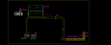 主管道更換為直徑700mm的,各分支管道根據風量的大小相應變徑,設計管道風速為20m/s。引風機更換為流量不小于20000m3/h,風壓不小于3500Pa的。